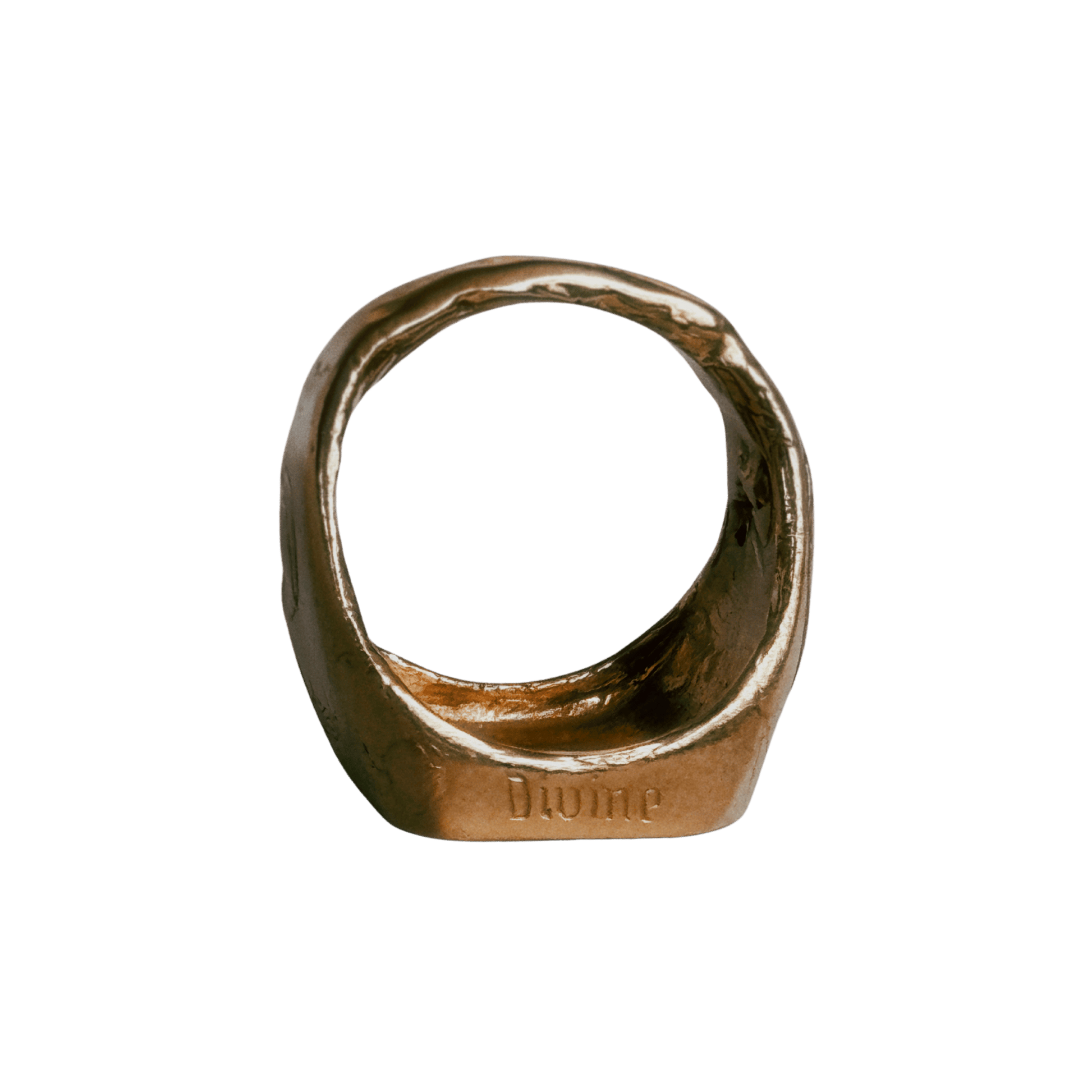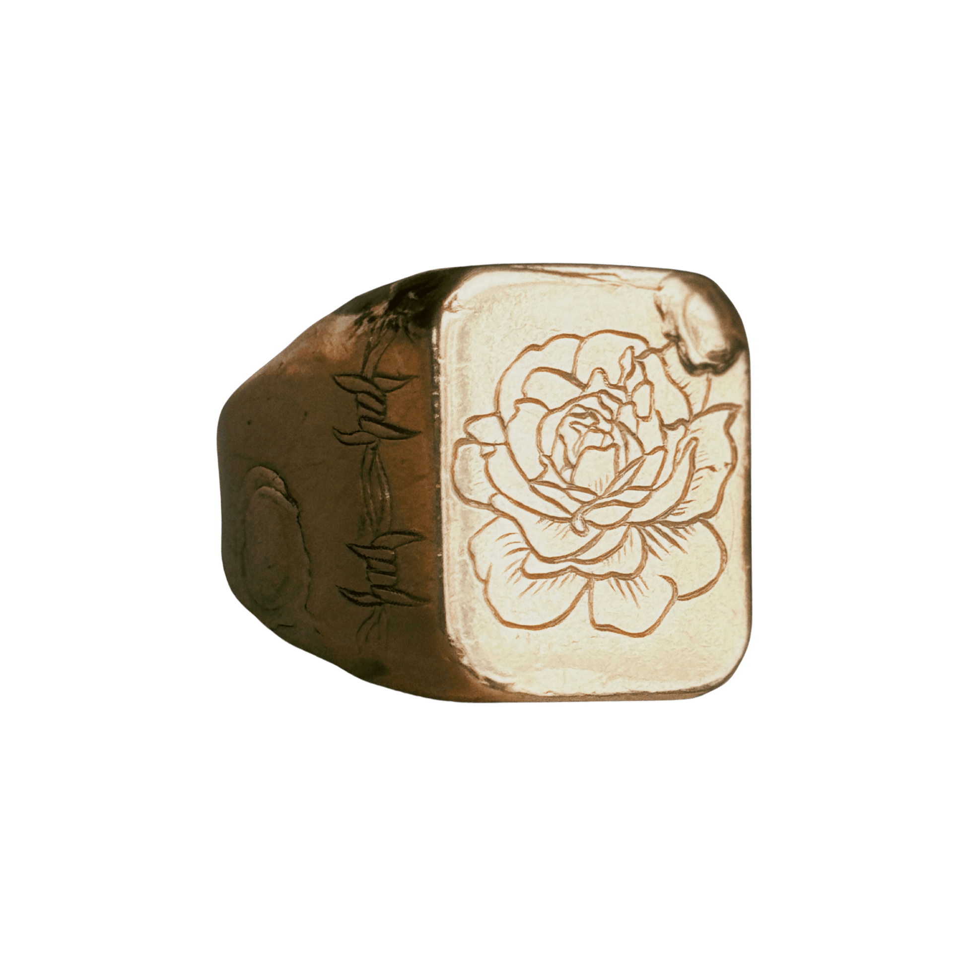 A square signet, bold and heavy. At its center: a single rose, carved by hand. Barbed wire wraps each side, framing the engraving—Divineon one end, Protection on the other. Every ring is one of a kind, hand-finished with our signature textured surface.