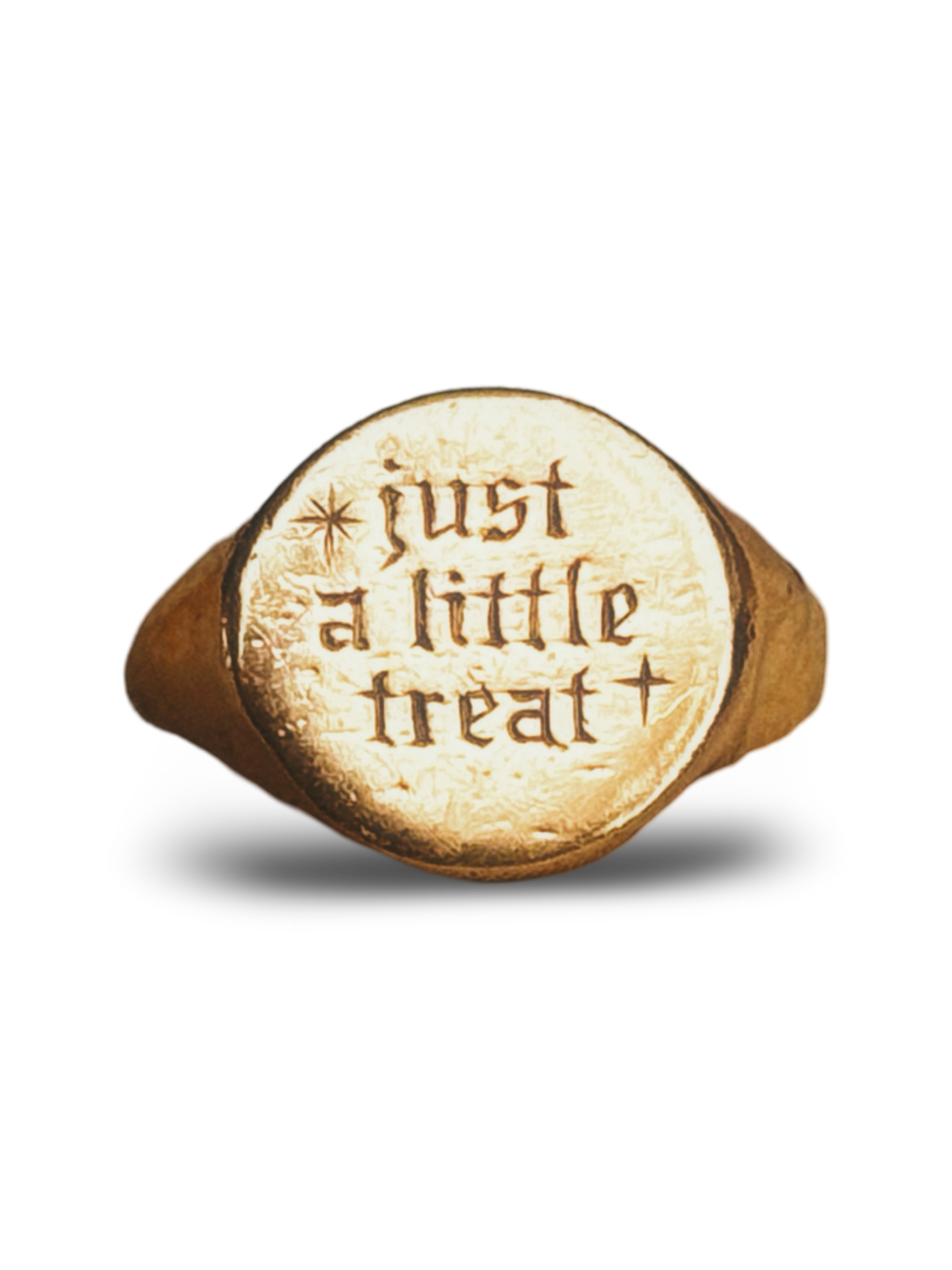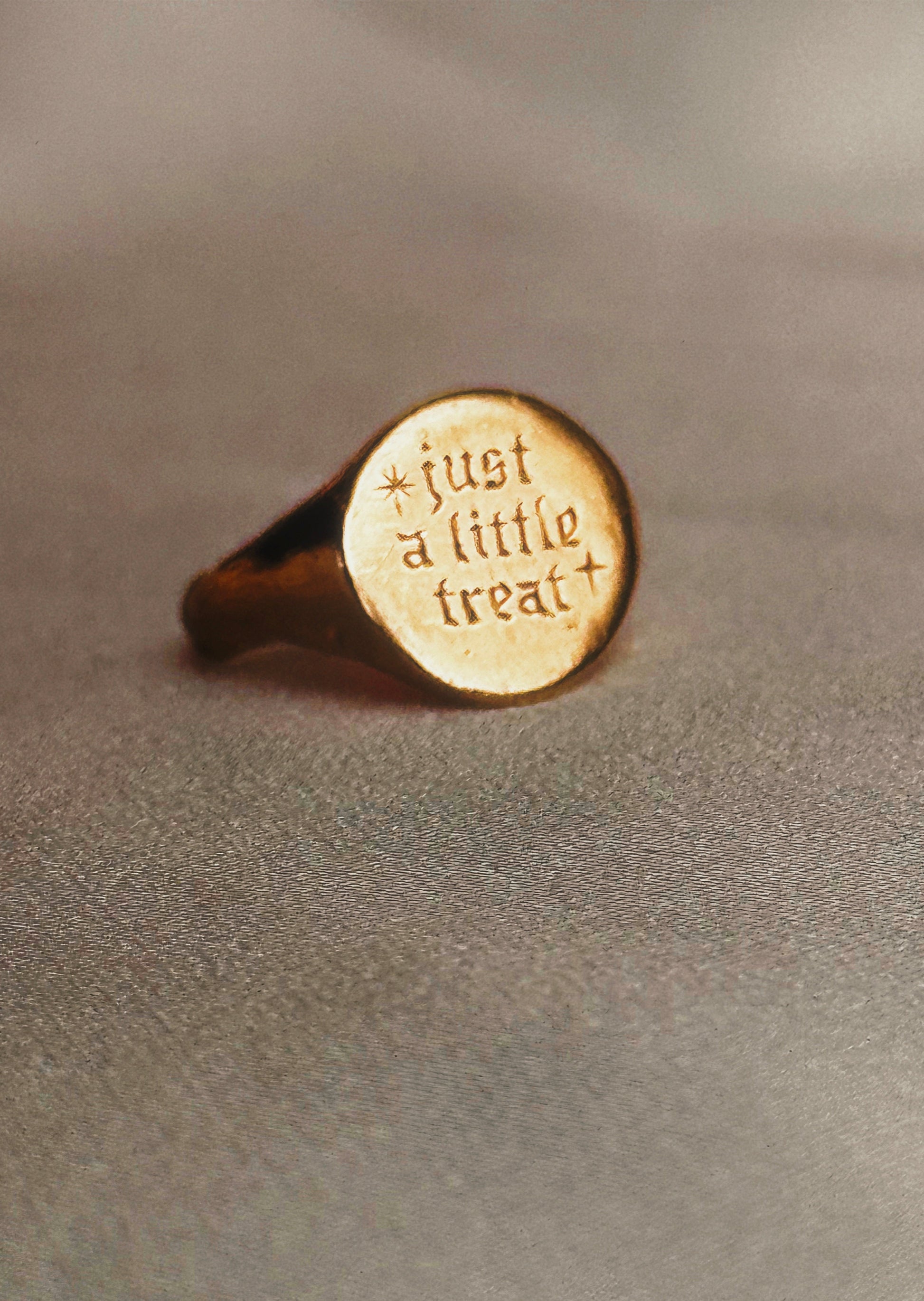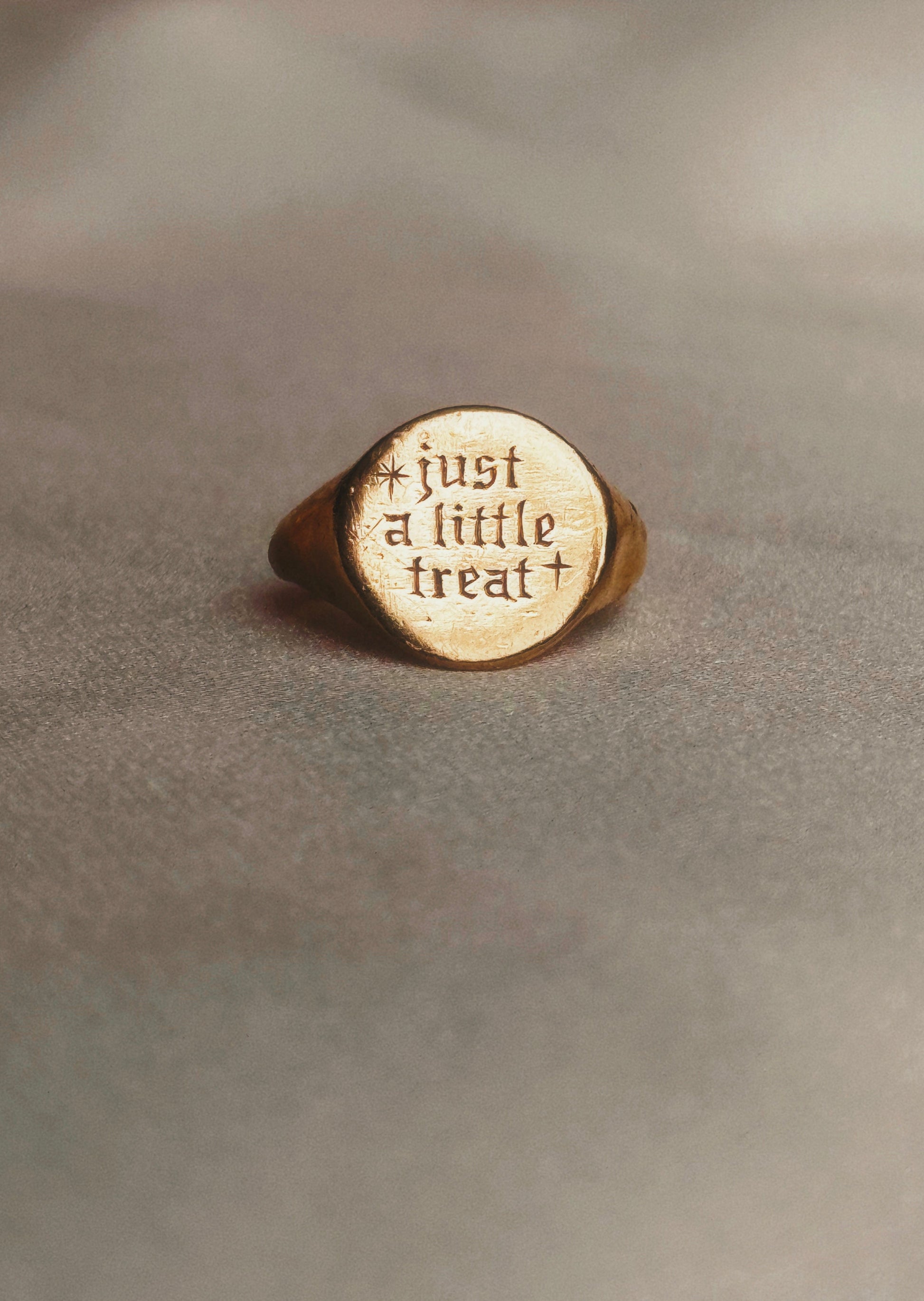A dainty solid 14 karat gold signet ring hand engraved with the phrase ‘just a little treat’ and adorned with little stars, the perfect tongue in cheek goodie for those who adore a bit of luxury.