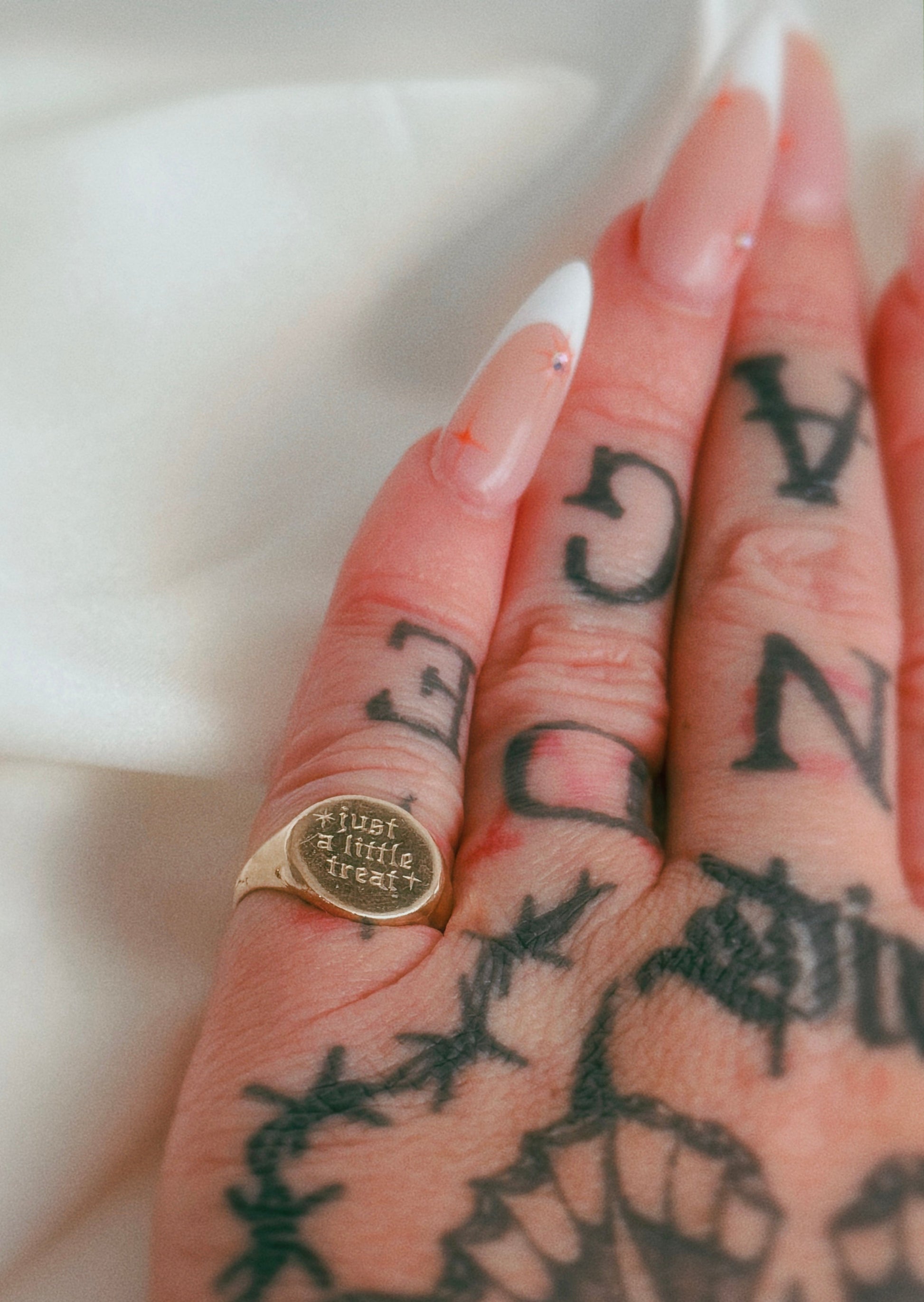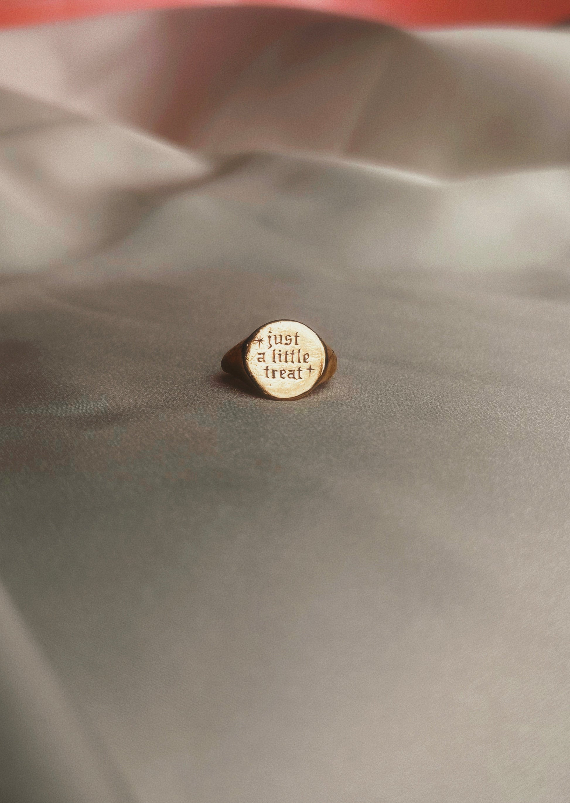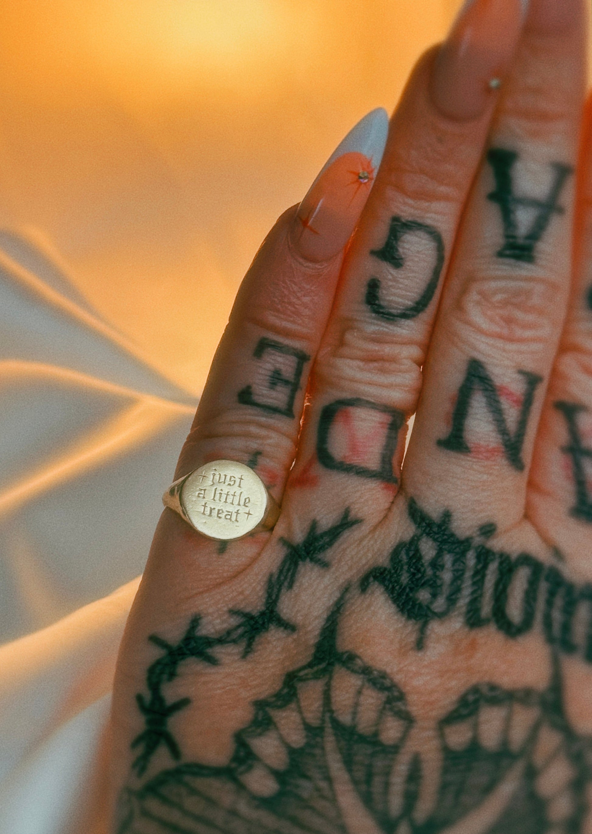 A dainty solid 14 karat gold signet ring hand engraved with the phrase ‘just a little treat’ and adorned with little stars, the perfect tongue in cheek goodie for those who adore a bit of luxury.
